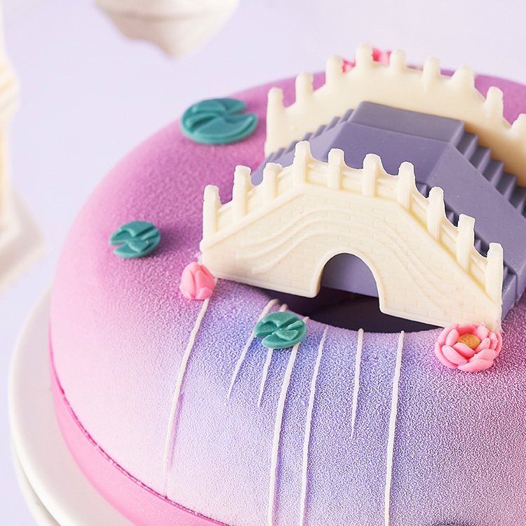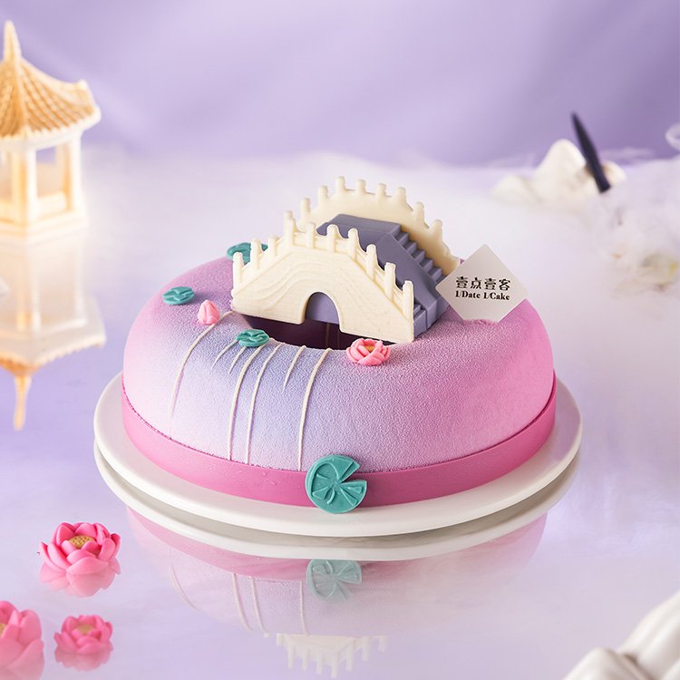 汉乐府民歌《江南》当中有这样一句词:“江南可采莲,莲叶何田田。” 正值采莲的时节,亭亭玉立的荷花,恰似窈窕多情的采莲女,惹得人心萌动,情愫暗生。壹点壹客化身中国文化传承者,手捧中式蛋糕「江南可采莲」为你而来,用视觉与味蕾加持,中国传统石桥元素寓意“鹊桥相会”的美好爱情故事,莲花、荷叶、流水点缀,描绘了粉墙黛瓦,青石古桥,莲舟荡漾,船影倩影,烟雨长廊,这便是一步一景皆成诗的江南水乡。素有“皇帝供品”之美称的中国芋、传统的中式食材紫薯与燕麦相结合,红丝绒蛋糕胚的融入,口感微甜不腻,麦香四溢,愿每位品尝蛋糕的人儿都能体会到其中蕴涵的诗意情怀与浪漫温馨。